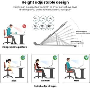 - Adjustable & Ergonomic : 6 heights of laptop screen can be freely adjusted from 2.15” to 6” for a perfect eye level, letting you fix posture and reduce your neck fatigue, back pain and eye strain. Very comfortable for working from home, office and outdoor. Laptop stand adjustable can be used as elevator for laptop.